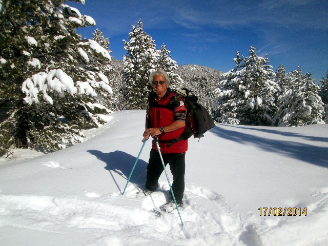 Des traces d’animaux sont repérées, leur origine laissent perplexe…Sur le retour vers l’auberge, nous traversons le barrage du lac et cela donne l’occasion d’une irrésistible envie d’une bataille de boules de neige…Après le repas de midi. la reprise d’une rando. départage une bonne partie des marcheurs. Un groupe de 7 acceptent de rechausser les raquettes et partent toujours sous la conduite de Christiane pour une virée dans la forêt de la Matte. Une bonne épaisseur de neige recouvre désormais notre environnement. Les branches des arbres ploient jusqu’au sol. Le silence est rompu par les chutes de paquets de neige des arbres, survivants de la tempête « Klaus » qui a sévit sur le Département en janvier 2009. temps cumulé matin et après midi = 5 h - distance cumulée = 8 km – dénivelé = négligeable Groupe « le Pla dels Avellans » alt. Maxi = 2050 m – dénivelé = 473 m - distance = 12, 5 km (source Michèle Labadie) Troisième randonnée : Lundi 17 février 2014 9 h 30 départ en minibus pour Puyvalador. Thierry est notre conducteur et guide pour la journée. Parvenu à la station de skis de Puyvalador, le minibus dérape dans un virage, la chaussée est recouverte de neige et verglas. Après plusieurs tentatives pour remettre le véhicule en position de stationnement correct, le groupe est prêt pour la randonnée en