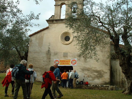 arrivée à la chapelle Sant Pau La chapelle actuelle a été édifiée de 1686 à 1689, à la place d'une chapelle romane ruinée, mentionnée dans un acte de 1146. Elle a été restaurée en 1988 par la commune de Reynès. Ce sanctuaire est dénommé "Dels Enamorats" (les amoureux) en raison des "prometatges" (fiançailles) que l'on y rendait autrefois officielles, traditionnellement le jour de l'aplec (pèlerinage, fête votive), le 25 janvier. ref. Georges Marill, panneau d'information situé à l'entrée de la chapelle