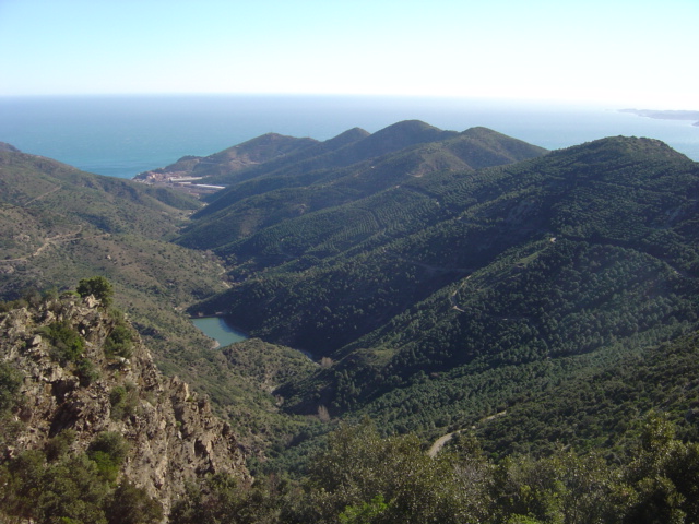 panorama vu du sentier vers le Col de Tarabaus avec le Panta (barrage), Port Bou et la mer