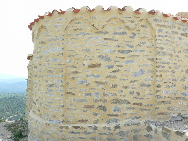 Le chevet de l'abside romane, semi circulaire, orné d' arcatures aveugles et de lésènes. Le bâtiment vient d'être restauré et attend encore sa patine.