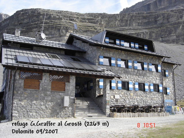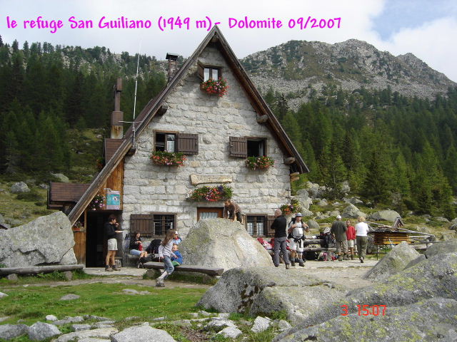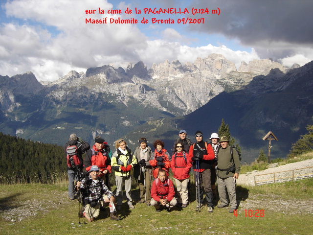 (Cliquez sur la vignette pour agrandir l'image) Séjour en Italie du samedi 01 au lundi 10 septembre 2007 _ Dolomite de Brenta Chronologie Après septembre 2005, ce second séjour dans cette superbe région que nous avions exploré une première fois, s’annonce prometteur à maints égards. D’une part se profile l’attrait de cheminer dans une contrée réputée pour ses multiples possibilités de randonnées pédestres, et d’autre part l’organisateur fort bien éprouvé par sa première expérience est déjà un gage de réussite. Henri Rigole en l’occurrence, nous propose ce séjour dans les Dolomite de Brenta. Massif montagneux situé dans la Vallée RENDENA ,.non loin de TRENTO. Les randonnées « en étoile » à partir de l’Albergo Ristorante CAPANNA DURMONT