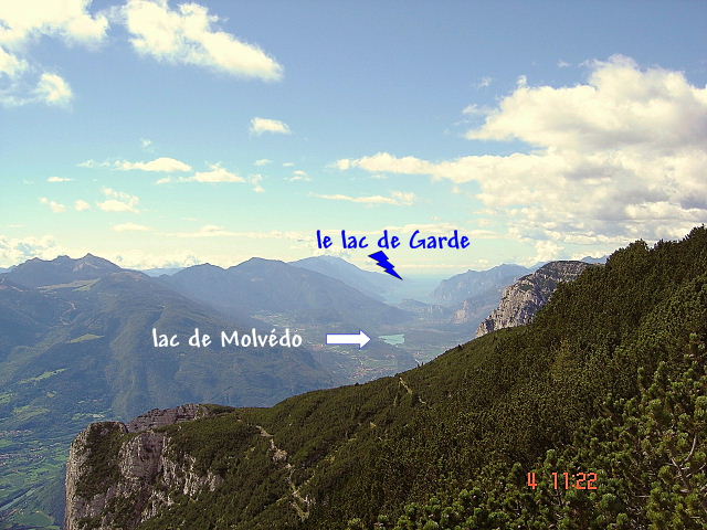 est saluée par les randonneurs …essoufflés mais ravis de réussir un challenge personnel. Avant de quitter les lacs on remarque une église en hommage au Saint Guiliano (datée de 1941) Le chemin du retour est une longue descente qui exige de chacun une forte concentration ; d’autant que le ciel menaçant décide de nous compliquer notre progression en ouvrant « ses vannes »…. La nuit gagne du terrain et la pluie redouble lorsque enfin nous parvenons aux voitures. Justement ce soir Danièla, notre hôtesse nous a concocté des spécialités régionales qui nous mettent du baume au cœur et réjouissent nos estomacs !…. Dénivelé : 1280 m _ Temps de parcours : 11 heures (dont 4 h d’arrêt…)_ distance : 20 km 3ème randonnée : mardi 04 septembre : Tout le groupe se rend en voiture jusqu’à ANDALO (alt.1042 m).Les cabines du téléphérique nous emmènent dans un premier temps à mi-course (1547 m).A partir de ce point l’ensemble des randonneurs entreprennent par la piste l’ascension de la cime de la PAGANELLA (2124 m) . Mythé et Evelyne poursuivent la montée en cabine. Ainsi les16 participants prennent le repas au refuge « LA RODA » avec en prime outre un soleil resplendissant, un panorama sublime : au premier plan le lac de MOLVENO et tout au loin le fameux lac de GARDE ….Le massif des Dolomite de Brenta est presque à portée de main , il occupe tout l’horizon que l’on mitraille de nos objectifs photos. Le retour s’effectue par le sentier 604, et nos 2 « touristes » reprennent la cabine jusqu’à Andalo, terminus pour tout le groupe. Quelques emplettes à Andalo, avant de reprendre la route direction TIONE di TRENTO. La strada longe le lac de Molvéno dominé par les massifs montagneux où culmine entre autre la cime de Brenta (3151m). Dénivelé : 600 m _ Temps de parcours : 4 heures _ distance : 11 km 4ème randonnée : mercredi 05 septembre. Programmée pour effectuer un circuit autour de 5 lacs au départ de Madonna di Camplio nous décidons de modifier nos plans, du fait de la fermeture annuelle des téléphériques. Le point de départ de cette randonnée est situé à Malga (camp) – Ritort (1735 m) près d’un refuge et d’un important rassemblement de véhicules .Un soleil éclatant mais froid augure d’une journée qui s’annonce favorable à notre marche. Nous sommes toujours sous « la haute surveillance » des sommets de la chaîne des Dolomites. Rares sont les blasés d’un tel spectacle où la Nature a façonné un irréel château garni de tours à toucher le ciel…. Nous parvenons au 1er lac perché à 2063 m. par un sentier en lacets (n° 278). Le LAGO RITORT,