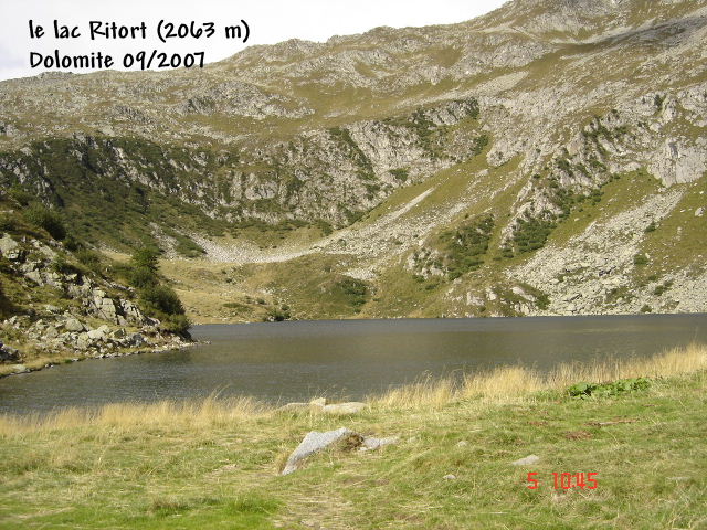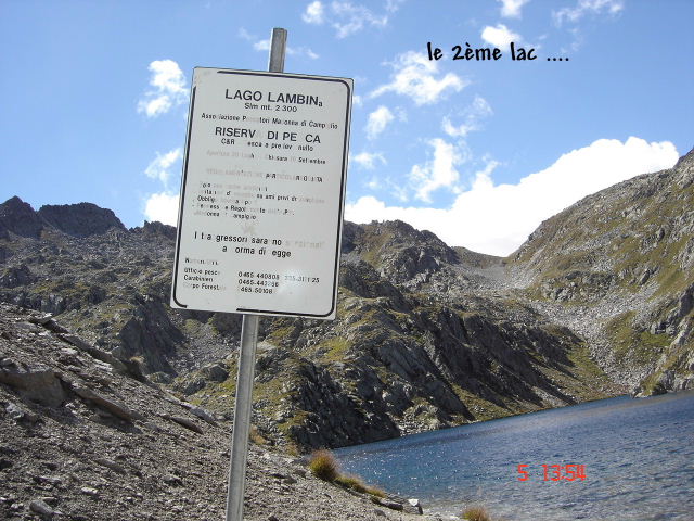reflète le ciel bleu. Mais le vent glacial qui souffle refroidit l’atmosphère et… nos ardeurs, sans toutefois nous décourager. Par le sentier 232 nous atteignons le PASSO (col) della Falculotta (2295 m) avant la découverte du 2ème lac le LAGO LAMBIN. à 2329 m. Les randonneurs cheminent en direction du 3ème lac qui apparaît dans un paysage enchâssé de sommets vertigineux. Il s’agit du LAGO SERODOLI