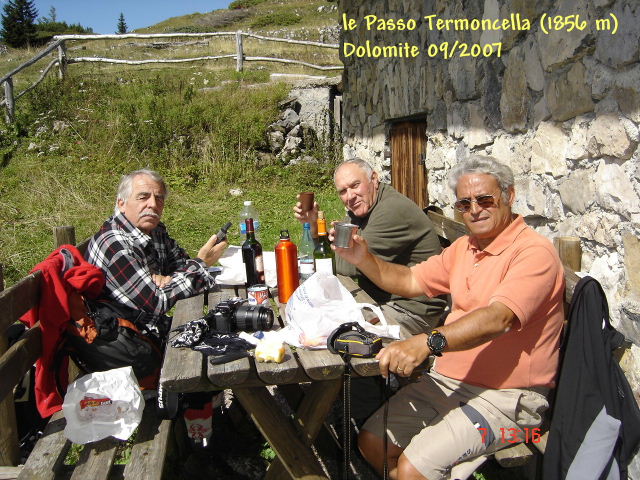 car la pureté du ciel est remarquable. Pause repas à l’abreuvoir (un énorme tronc d’arbre évidé) avant de descendre au refuge Capanna Durmont, car il est temps de préparer les bagages. Le départ est prévu lundi 10 après le petit-déjeuner Dénivelé : 550 m _ Temps de parcours : 3 heures _ distance : 09 km Francine et Jean-Marie nous ont précédé dès dimanche matin. Les dîners étaient l’occasion de se rappeler les péripéties de la journée dans une franche convivialité. Lors des soirées, Henri et Jean vérifiaient les cartes, entraient les données sur leurs G.PS. (jumeaux) sous l’œil intéressé de Jean-Charles, qui lors des randonnées partait en éclaireur sur les sentiers le regard fureteur. Gilberte infatigablement parcourait les montées, mais se réfrénait aux descentes car le nez au sol pour dénicher éventuellement un bolet. Annie et Christiane s’ingéniaient, avec complicité dans des facéties qui égayaient nos ballades. Georgette dont la bonne l’humeur contaminait tout le groupe sur les pistes et sur la piste (de danse) était rejointe par la non moins souriante Francine. Mythé initiait Evelyne à la marche en sous-bois. Le résultat est encourageant. Après avoir tenté de mettre un point…d’honneur à persévérer, Evelyne reprenait son point de…croix, tandis que Mythé alternait les randos. avec la lecture au petit soleil prés de l’Hôtel ou du belvédère « Dotor ». Félix (notre gentleman-farmer) mais néanmoins marcheur émérite, arpentait les chemins avec une régularité de métronome. Jean-Marie entretenait sa foulée souple et précise du marcheur plus prés du coureur de fond. Jean-Michel notre poète contemplateur, admirait la nature avec la gourmandise d’un esthète. A l’occasion une petite poussée de bel canto et une gouaille de bon aloi réchauffait les soirées. Bruno photographe- reporter de circonstance, engrangeait à chaque sortie une multitude de clichés qui faisaient la joie de l’équipe lors des soirées photos, grâce à l’ordinateur portable de Maurice. Bruno avait une autre mission outre la photo, celle de serre-file, dont il s’acquittait avec sérieux et régularité. Claude, servait souvent de modèle, tel un montagnard tantôt rigolard, tantôt en posture de grande réflexion. Henri, initiateur de ce séjour et animateur, a conduit les 8 randonnées avec constance et compétence. Notre hôtesse Danièla , travailleuse effrénée a déployé des trésors de dévouement à l’égard de notre groupe. Une cuisine souvent régionale a activé nos papilles à maints occasions. Chacun estime que la réussite d’un tel séjour nécessite plusieurs facteurs : une météo favorable vient en tête, suivi d’un territoire réputé pour les randonnées, un animateur tout aussi réputé (nous l’avions déjà) un minimum de confort au refuge, et bien sûr l’accueil et le service. Tous ces paramètres étaient réunis lors de ce séjour dans les Dolomite de Brenta.  Quelques statistiques : Dénivelé cumulé : (positif et négatif confondus) 5 530 m Distance parcourue : 107 km Temps de marche : non compris les arrêts) 45 heures Ces données n’ont pas l’ambition d’une rigueur absolue, mais représentent une estimation (assez) proche de la réalité. Rédacteur : Maurice Bénichou