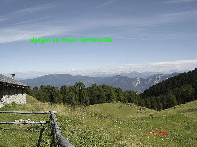 le paysage qui s’offre à nous est propice à la contemplation …En effet des prairies bordées de mélèzes, où trônent 2 chalets (non habités) nous incitent « à camper » dans ce décors bucolique . Mais les bonnes choses (ont toujours) une fin et nous reprenons notre marche par le sentier 330 à travers la forêt. Celui-ci en courbe de niveau (1800 m) durant un bon moment met à l’épreuve notre motivation ! Enfin par le sentier 369 nous amorçons la descente vers le lac Tovel.