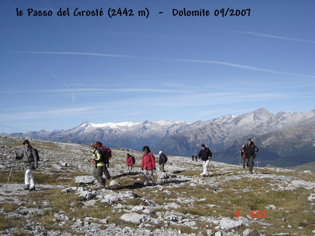 Que nous atteignons en empruntons le dernier sentier 314 qui est une piste ; un second tour du lac et c’est les voitures que nous retrouvons avec Jean-Michel qui avait choisi d’écouter les oiseaux ….. Dénivelé : 900 m _ Temps de parcours : 6 heures _ distance : 20 km 7ème randonnée : samedi 08 septembre nous allons ce jour tutoyer les sommets du Parc Naturel de Brenta. L’ensemble de l’équipe prend les cabines du téléphérique au départ de Malga Carlo Magno 1642 m (près de Madonna di Campiglio). Arrivés au terminal, le Passo del Grosté,