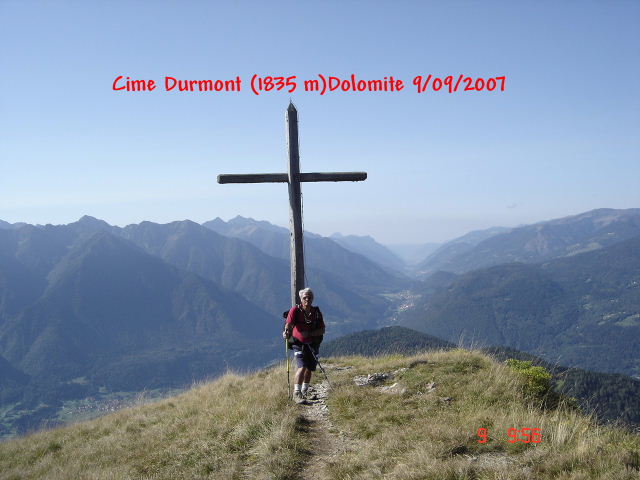 à flanc de parois est semé de fossiles que chacun s’évertue à dénicher. La pause panier pique- nique (préparé tous les jours par Danièla et Andréa son cuisinier) est la dernière que nous partageons ensemble. Une pointe de nostalgie se fait (déjà) jour…. Retour à Malga Carlo Magno via le téléphérique pour rejoindre qui notre hôtel ou pour d’autres des achats de dernière minute. Dénivelé : 450 m _ Temps de parcours : 3 heures _ distance : 13 km Cette avant dernière randonnée a bénéficié d’une météo très favorable. Les retrouvailles de tout le groupe autour du verre de l’amitié est d’une part l’occasion d’ovationner notre animateur et d’autre part lui offrir un présent qu’il s’empressera de revêtir. Henri est ravi dans ce blouson qui lui va comme…. un gant. 8ème randonnée : dimanche 09 septembre Ce dernier parcours, est connu ; la Cime Durmont nous l’avons déjà « dans les jambes » depuis le 02 sept. 6 irréductibles randonneurs avec à leur tête l’inoxydable Henri, entreprennent cette ascension par une météo excellente, au départ du Passo Daone. (Hôtel) La croix fixée sur la cime Durmont